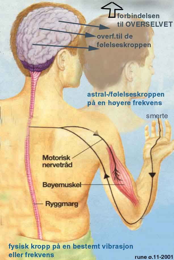 Folk flest tror at hjernen sanser - men den åndelige forklaring er at dette er en "delvis" sannhet. Eksempel jf.bildet: Peter brenner seg i fingeren og nervetrådene der leder budskapet om dette som en elektrisk impuls opp til hjernen. Der blir denne mikrostrømmen - eller da budskapet - formidlet over til hans følelses/astralkropp og fra denne "går" budskapet opp til overjeget (X2 og "skjebneelementete") og erfaringen lagres tilslutt i hans hukommelseslegeme, som vil gjenkjenne erfaringen senere. Selve sansningen er derved en gjenkjennelsesprosess og egentlig en åndelig eller "indre bilde-gjenkjennings-prosess." Hjernen er en "radiosender