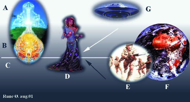 Both earth and earthman are belonging to the evolutionary stage of the "intelligent animal". In this stage they shall learn to get control over the instinct of self-preservation. Can be said beeing the "old programming of the computer of consciousness" that the beeing has done in previous lives. Both light and dark forces from outside are trying to influence it - coming over to their own side. But the beeing itself must choose - and does so from its erarlier experiences that the overself has stored in the "eternalbody/memorybody".