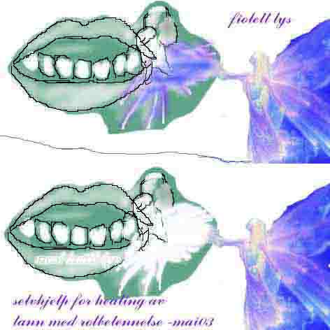 da jeg i lang tid har hatt problemer med betennelse under en jeksel våknet jeg en morgen med denne ide å visualisere et MEGET STERKT RENSENDE LYS som omgir det angrepne området. For å hjelpe visualiseringen av det kan man stå i speilet å se på tanna så lenge at man har et klart bilde av den - og så legge/sette seg ned å skape bildet der man sender konsentrert lys til området. Man kan også kombinere dette med bønn om hjelp for de mikrovesner som bebor smerteområdet - og be om dem får hjelp med å stoppe de voldsomme KRIGER SOM RASER I DERES SAMFUNN i mikrokosmos i kroppens indre. Man kan bruke både hvitt og fiolett lys. MAN MÅ GJENTA DETTE KONSENTRERT OG I FLERE DAGER/UKER - dette avhenger av ens konsentrasjonsevne og ens karma - HVA SKAL MAN LÆRE AV SMERTEN?