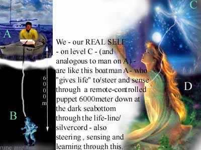 In terms of an entity perceiving through as linear time structure, the higher self exists in sixth density and functions in the entites "future". One interesting aspect of it is that the entity who is perceiving the higher self manifestation is actually a thoughtform materialized by the "higher self" itself. Entities in these terms are actually a complex composed of what they perceive to be mind", "body", and "spirit". These complexes can occur within single entities or groups, depending on the specific space/time conditions. The higher self is that self which exists with full understanding of the accumulation of experiences of that entity. At one point, the entity perceives a lower self and a higher self. They are not actually there "simultaneously"; functions of the higher self interact from a position in development which equates to the linear "future" of the entity, as perceived by an entity in this state. Obviously, cultural conditioning encourages development of impotent states of mind where the "lower self" is in control and the "higher self" is reached very little or totally ignored. There is no synthesis that will permit the energy of the intelligent matrix to flow correctly.
