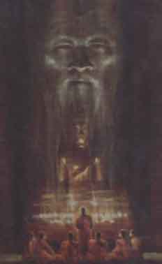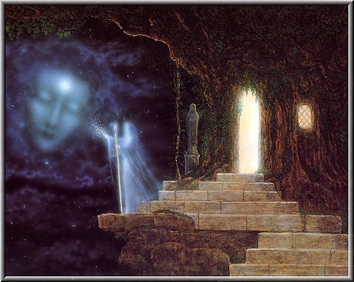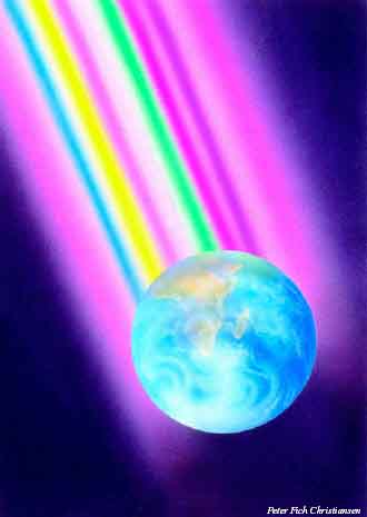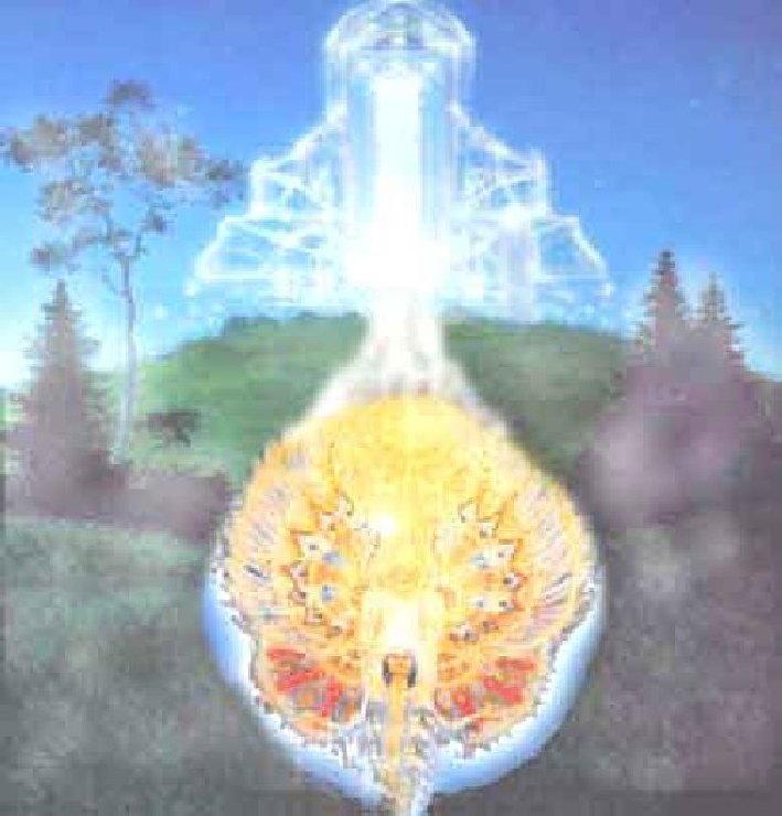 på de høyere plan der det er enklere og lettere å skape med ren tankekonsentrasjon, finnes de vakreste former og farger med en intensitet og indre glød som det ikke er mulig fullt ut å gjenskape i jordens nåværende vibrasjons/frekvensnivå. Bildet over er malt av den fantastiske visjonære kunstner Gilbert Williams - som forteller at han allerede som barn hadde en evne til å motta bildeinspirasjoner fra "det kunstneriske astrale plan". Bildet er ikke fra boken som her omtales. Noen flere bilder fra samme kunstner lenger ned.