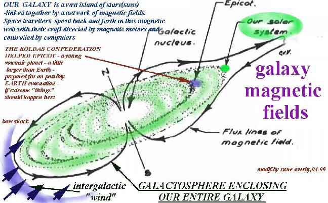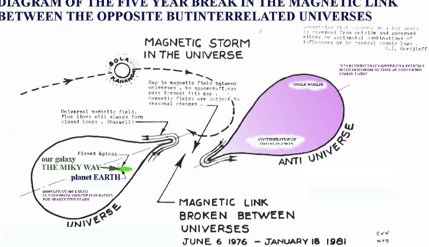 På denne jord, på deres planet, avtegner det seg ting av stort format. Vi ser allerede de store hendelser, som forestår for jorden og menneskeheten. Vi erkjenner stadig klarere at vi må utruste våre romskip med tilleggsinnretninger. For planetenes konstellasjon vil forandre seg merkbart og også planetbanene. Dermed forandrer også gravitasjonen seg. Vi må anstrenge oss betydelig for å utstyre romskipene slik at vi, etter å være kommet inn i deres solsystem, også kan komme oss ut igjen av eventuelt oppståtte magnethvirvler. Magnethvirvlene er store sorte punkter. Man kan også kalle dem hull. I dem oppstår det enorme sugevirkninger. Hvis vi ikke forutså dette kunne våre romskip ta skade - ja det kunne til og med hende at det ble ubrukelig og at våre legemer, dvs vår delvise fortetning, ville brenne opp. Også våre eterlegemer kunne herigjennom ta skade. (Problemer med slike magnetstormer beskrives meget interessant i artikkelen UFO-CONTACT FROM KOLDAS - som ligger på denne samme nettbase i engelsk utgave, R.Ø.anm.)