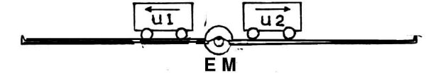 Then one little wagon is placed on each rail and each wagon has a catch with a catchwheel (tilbakeløps-sperre) on one of the wheelaxes, so the wagon can ride in only one direction. The movement in the other direction is blocked. The wagons are placed with their rears against each other, after which the electric motor is switched on. If the teeth of the catchwheel have the same beat as the vibrator mechanism, the wagons roll away from each other with exactly the same speed to the end of each rail.
