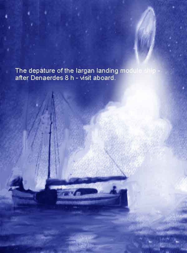 The fear grew into panic, a panic which told me to get away from there as quickly as possible, before it was too late! I sprang overboard again and raced through the shallow water toward the ship as though the Devil were at my heels. Panting, I pulled myself on board and started the motor. Reverse full power. I wanted to get away from there as quickly as possible. The ship didn't move an inch. Over the bow I saw the being pull the dinghy onto the dark platform, lift the body in his arms and walk away with robotlike steps. It suddenly went dark and they were gone. With a feeling of apprehension, I stopped the motor. The situation on board was surprisingly peaceful, for they had no idea of the real drama. There was a feeling of satisfaction over father's ability as a lifesaver. My eldest daughter had developed the theory that we had rammed a submarine, which was not so unlikely, considering we were dose to a naval training area. Only Miriam realized that something was wrong. She looked at me as though I were a stranger and her uneasiness grew by the minute. She had never seen me like this before. She poured me a whisky and sent the children to bed with the excuse that we had something to talk over. The alcohol did me good, but now it seemed that I had another problem: Miriam didn't believe me! "This trip is too much for you, Stef. There are no men from Mars in the Oosterscheldt." She kept talking, perhaps to try and talk some courage into both of us. I couldn't just stay inside; I had to see what was happening outside.