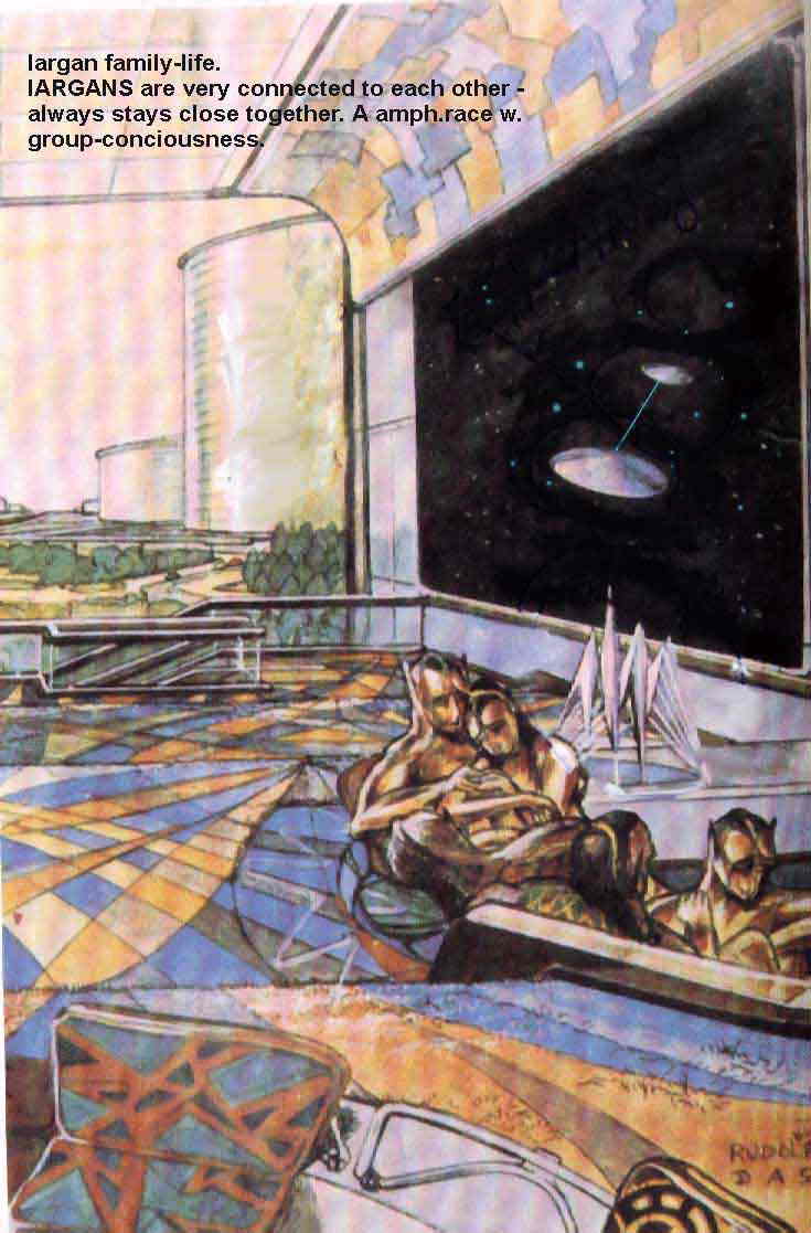 The aim of the first part is therefore purely the identification of this alien race and is not an attempt to create some kind of picture of earthly ideals, something that we should try to emulate. Iarga is different in every way. The planet and her inhabitants have a different mentality and character, and therefore a different cycle of evolution. One difference is that Iarga is almost completely covered with water. The available area of land is. spread over numerous islands with a total surface area not much larger than Australia, and according to our standards, is much too small to feed and accommodate the billions of beings needed to reach the goal of their creation. The extreme efficiency of their planning and food production methods would be pointless on Earth, and their population density forces them to a kind of over-socialized community. Only beings that posses the ability to continually improve their mentality and eliminate all aggression, have a chance of reaching perfection on such planets. We do not have this ability, the reincarnation-selection of Iarga does not exist on Earth. Here, the weeds grow up with the corn until the harvest.