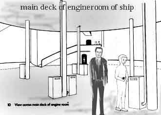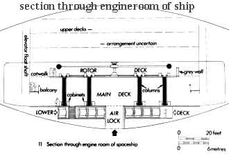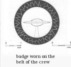 He was still in a somewhat dazed condition when Serkilias came over to tell him his examination was complete. She had to repeat it several times before she could get through to him; finally she smiled as John's response showed that he understood what she was saying; she said again: "Your examination is complete, John". Serkilias gave him to understand that they had to wait for someone who would come and fetch him. While they were waiting, she explained about herself and her colleague: "We do the medicals; that is our job". As she said 'medicals', she touched a yellow band on her shoulder - the other girl also had one - perhaps indicating that this was a badge of her office. She helped him to stand up; at first he was a little unsteady on his feet. He tried to question Serkilias about who they were, what they were doing, and why they wanted him examined: but she parried adroitly all questions of a general nature, saying that the man who was coming would tell him everything. She repeated: "The examination is to see if we can adapt". As they were talking, Serkilias moved down the room towards the desk; Cosentia was already behind the desk. As she walked the distance of ten feet or so, John followed her to continue the conversation. In doing so, he noticed that she was carrying in her left hand a flat square silvery-metal box, about five inches square by one inch thick, with rounded corners. As she was saying "to see if we can adapt", she was walking round the left hand end of the desk, so that her right side was towards him, and his view of the square box was partially obscured; but he could see that she put it into some kind of slot in the face of the instrument panel, on a level with the desk top, but in the wall panel, not in the desk itself. He was, by now, on the room-ward side of the desk. John had an uncomfortable feeling; he said "what have you done?" or words to that effect, indicating the square box. Serkilias replied: "Samples, They are going to be analysed. We have taken blood samples". Now John, as it happens, has a particular dislike of having blood samples taken; even the prospect of it makes him go hot and cold, and feel "horrible", he says. He had this feeling very strongly now. He says that the two girls realised he was alarmed and upset, and they were smiling and laughing in a friendly, reassuring way to let him know it was O.K., and not to worry. Presently, the man they were expecting did come in: it was Anouxia, who had brought him to the medical room. John now noticed that, instead of a belt badge. Anouxia had on his chest an absolutely plain white disc, of about five and a half inches diameter, with no visible markings on it. (Uxiaulia, who talked to Frances, had a similar disc.) He was a man of about John's own height and build - John is six feet tall, and slim -and he wore no helmet; his hair was fair and cut very short. He had blue eyes, like all the ship people. Anouxia first talked with the two medical technicians in their own language; it sounded rapid to John, as foreigners' talk is apt to do. They kept glancing in his direction, and seemed to be discussing his case. Finally, Anouxia came over to John, who had moved aside. He said he would show him over the ship, and answer his questions. John took his leave of the two women, who smiled goodbye; and he followed Anouxia along a corridor, which was rather dark; there was just enough light to see by. He noticed that the corridor curved slowly to the left as they walked: in the right hand wall, from time to time, they passed a circular porthole of thick glass; John could see only darkness through the portholes. Presently the man stopped in front of him, in a completely dark space; John almost bumped into him, but he could just make out a faint silvery gleam on his shoulders. He was just wondering why the man had stopped, when he felt himself floating slowly downwards: it was like being in a lift, he said, but much smoother, and silent. Although he could not see anything around him, he had a sense that the space was circular; perhaps there was a very little light, because he could just make out his companion. They floated downwards some way, then came smoothly to a stop. Anouxia led the way, as before; they left the elevator, or whatever it was, not by the way they had come in, but to the left: John was quick to realise that the corridor must have followed the curve of the hull; so that this left turn would take him towards the centre of the ship. They came out through a doorway, on to a balcony overlooking a huge circular room (John estimated its diameter as 150 feet - 45 m) with many pillars or columns supporting the ceiling. It took him a little while to realise that this was the same balcony on which he and his family had been welcomed by Anouxia and the other officers of the ship: that the vast circular room was the same that they had entered from below, through a big square hatchway, from the airlock entrance under the ship. Somehow it looked different, coming to it like this, from the other direction. John says that he asked where the others were, meaning his family; Anouxia replied: "Do not be alarmed; you will see them soon: they are in their medical, and are being shown other parts of our ship". Anouxia seemed preoccupied (åndsfraværende); and John had time to look about him. Just in front of him was a handrail; the balcony stood, he thought, some ten feet or so above the circular deck below. The handrail was shaped just to fit a human hand comfortably; the space below it was filled in with metal panels. To his right, the balcony ended, the handrail being turned through a right angle until it met the wall behind. To his left, the balcony, with its handrail, continued in a downward slope to the main deck; and he remembered the moving ramp up which they had glided, going up to the balcony when they first arrived. Right opposite he could see on the far side of the room a similar balcony; he could see two ar