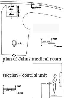CHAPTER SEVEN John Examined WHEN THE FAMILY separated after the speech of welcome on the balcony, John was taken along a short corridor to an examination room, similar in functional arrangement to the room Frances was taken to, but different in shape and detail. The officer who accompanied him was the same one who later showed John round the ship, and is almost certainly the one who made the welcoming speech. He told John his name was Anouxia (pronounced 'Anno-Youksia'); he spelt his name out for John in the same way as Uxiaulia did for Frances, in a series of letters seen in the mind. Anouxia is clearly of responsible rank; and we would be inclined to call him 'Captain': but Uxiaulia told Frances that no one was in complete charge of the ship, which was run mainly by a computer. Anouxia left John in the medical room, saying that he should wait there until someone came to do his medical examination; in fact John was left alone in the room for several minutes, and occupied his time, quite naturally, prowling (luske omkring) and having a good look at his surroundings. The shape of the room, as he describes it, is peculiar: the central feature is a black-upholstered 'dentist's chair' similar to that used by Frances; but the wall are as shown in the plan. There are two entrances to the room: one behind the chair, through which John entered, and another in front of a person sitting in the chair, not directly in front but somewhat to the right. This was not just a doorway, but a spout-shaped passage curving away to the right, with circular portholes, each about twelve inches across, on its left hand side. Directly in front of the chair, but about twenty feet away from it, is a section of straight wall, without portholes, to which an instrument panel is attached. The panel extends from about head height to about table height; it projects a little from the wall, no doubt to allow space for components and circuitry. Laterally, the panel is five or six feet in length; directly in front of the panel is a desk or cabinet, of the same length as the panel and parallel to it; there is a space between the desk and the panel sufficient for a couple of people to stand and work conveniently; and the floor of this space is raised by a step to form a dais or platform, so that a person standing behind the desk appears a little taller. The desk has a sloping top, the lower side being towards the instrument panel and away from the chair; there are instruments on the sloping surface generally similar to those on the wall panel, which carries a variety of knobs, switches, controls, meters and little coloured domes that light up. The height of the desk is such that it forms a convenient working surface for a not very tall person who stands on the platform, facing into the room. There are no instruments on the vertical front of the desk, facing the chair. Presently, two silver-clad persons came in; they were about five foot three inches in height, and of slight build. Although he did not immediately realise it, John later became aware that they were young women, very slim and small-waisted, with little breast shape as far as their silver uniforms showed. John said their skins were very smooth and fair; he thought they were quite young. Only the faces could be seen: in common with many of the spaceship people of either sex, their silver uniforms continued over the head as a 'balaclava' helmet, coming up under the chin, and extended over the ears as a thin ear-shaped silver skin, fitting the living ear closely; so that their ears looked slightly larger than normal, but silvery. One assumes there must have been an opening, because these people heard perfectly well. One of the two women went straight over to the desk and began operating the controls; she did not at any time speak to John, only smiled at him; he concluded that probably she spoke no English. The other one dealt with John personally and worked around him; he saw her quite close, and says that she was "most attractive, really beautiful, with a flawless skin". She spoke to him; apparently she already knew his name. She made him try to say her name, and that of her colleague, after her; there was much laughter over John's attempts to pronounce them. Her voice was contralto in pitch. The nearest he could get to her name was Serkilias (my spelling, pronounced as 'Sir-Keelious' with the second syllable stressed). She nodded and smiled when he got near enough to satisfy her. She told him that her colleague's name was Cosentia, the second syllable stressed. Serkilias said: "Sit down in this chair; we wish to examine you, to see how alike we are: to see if we can adapt". At the time, John did not understand what she meant; the significance of her remark became clearer when Frances reported her conversation with Uxiaulia, and we knew of the Janos people's desire to settle permanently on the Earth. John sat down as he was told: Serkilias pulled back his shirt-sleeves to expose his wrists (it was a warm night, and he was not wearing a jacket); and she made sure that his wrists were in exactly the right position on the armrests of the chair. Although he did not see her put them on, he found later that each wrist was secured to the armrest by a flexible band, about four to five inches long, so that his arms were gripped securely but not too tightly. His left hand was in a prone position, palm down; but the right hand was secured in such a way that the palm faced to his right, thumb down - an uncomfortable position, just short of painful. John said: "Another half inch of turning would have hurt. One must assume that the purpose of this was to make contact with electrodes let into the armrests. He also says that he found his legs were secured, the knees and ankles being bound together, so that movement was impossible. He had the impression, however, that this was merely a matter of holding him still; he says that Serkilias did not seem nearly so concerned about his leg f
