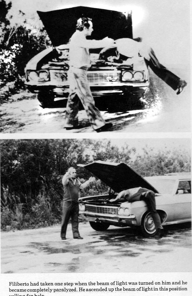 "At that moment the engine began to reflect different colors, red, violet, blue, orange and then a bluish white." They heard an intense buzzing noise, "like many thousands of bees," Cardenas said. "I tried to move but I was paralized in position, unable to do anything-even unable to move my arms. I could hear the screams of the women in the car. I looked down and saw that I was suspended in the air and rising. When I was 8 to 10 feet above the car everything went dark, and I don't remember what happened.
