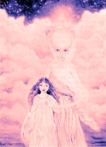 Zeichnung des Ausländers von Zeta-Reticulis mit einem Kind.